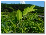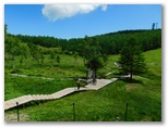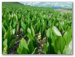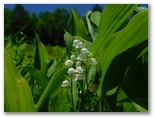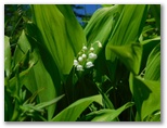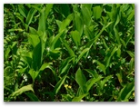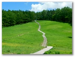 湿原の南東面に、スキーのゲレンデのような斜面があり、一面が優しい緑色に覆われています。すずらんの自生地で、その数、100万本! 可愛らしい花が、葉の影に隠れています。腰を思い切り低くして、目を近づけましょう。見れば見るほどたくさんあります。耳を澄ませば、リンリンと鳴る鈴の音が、心の耳に聞こえるかも ...。ところで、ゴンドラ山頂駅から左の道に進むと、すずらん自生地の最上部に立ち、ドラマチックに入笠湿原を目にすることができそうです。