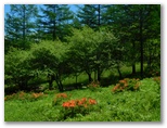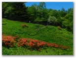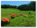 ところで入笠エリヤでは、「花畑」も「入笠山登山口」も、固有名詞(地名)です。林道に出たら「入笠山登山口」を経て「花畑」の西縁を直登することもできますが、私は鹿ゲートを通って、「花畑」のジグザグ道に入りました。「入笠湿原」と同様、植生保護柵で囲まれた「花畑」内のレンゲツツジは、ニホンジカによる食害から守られ、小群落がいくつもあります。このお花畑には、すずらん、ツマトリソウ、オオヤマフスマなど、小さな花もたくさん見られました。