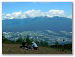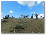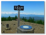 観光資料によると、入笠山頂は360度の大展望があり、深田百名山の22座が見えるのだとか。山が見えるか雲が見えるかを問わなければ、360度の展望は本当です。この日も、眼前に八ヶ岳を一望し、西面に御嶽山と乗鞍岳を望めました。富士山、南・北・中央アルプスは、雲に隠され残念。岩のひとつに腰を下ろし、八ヶ岳を眺めながら、おやつと冷たい飲み物で小休止しました。三角点石の長い根が露出しています。山頂は徐々に低くなってしまうのでしょうか?