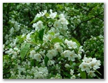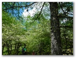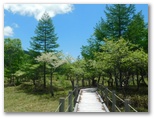入口から展望台までの150m区間は、車いすも通れるバリアフリーの桟道です。そこはズミの花道で、白い花弁が道いっぱいに撒かれていました。展望台からは、奥行き感のある湿原を望めます。白い雲の浮かぶ青空の下、静かな水の流れる緑の湿原。花盛りのズミや、姿の整ったカラマツなどの樹木が散在し、どこかでカッコウの鳴く声が聞こえます。「散策ガイドブック」によると、ここは3万年前に形成された高層湿原で、南アルプスでは極めて珍しいものだそうです。