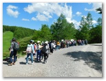 ゴンドラの往復チケットを買うと、「入笠に咲く花」という役に立つ小冊子がもらえるほか、ソフトクリームの割引券、山野草苗の引換券、「また来てねチケット」が付いています。何も持たずに来た人は、駅前の観光案内所で、割引券が付いたハイキング案内パンフレットをもらえるそうです。それもない人は、ネット上でも割引券が入手できるので、道すがら準備しましょう。気分よくチケットを手にし、緑の濃い山を見上げながら、ゴンドラ山麓駅まで5分ほど歩きます。
