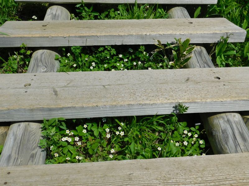 -- 木道の下にも逞しく、シロバナノヘビイチゴ。14:12
