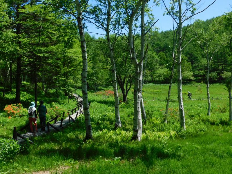 -- シラカバと湿原の緑が引き立て合う。10:37