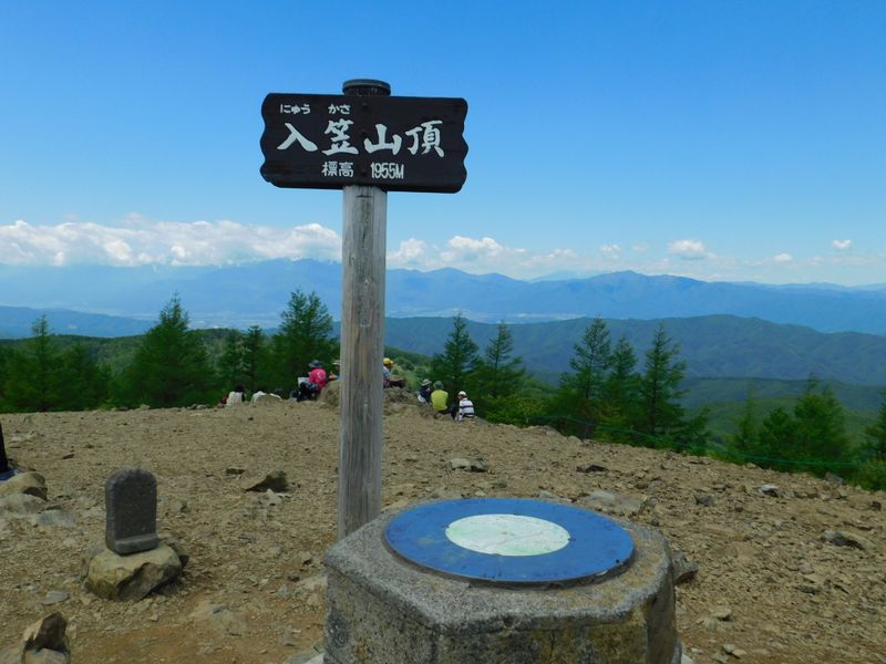 山頂標の背後に御嶽山。その右に乗鞍岳。