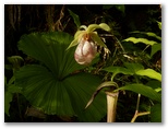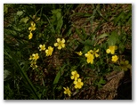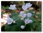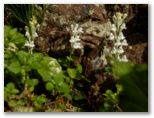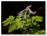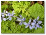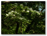 たぶん最後の民家の前だったと思いますが、ミニ野草園みたいに、アマドコロや白花タツナミソウが咲いていました。何と、クマガイソウもあります。その先の畑地には、チチブドウダンでしょうか、真っ赤なドウダンツツジの花がびっしり。右手の山腹には、新緑にからむヤマフジのうす紫がきれいです。そして道が、ほの暗い杉林に吸い込まれて行くと、代わって現れたのが、ウツギ、ガクウツギ、名前の判らないネコノメソウなど。シダロードもありました。