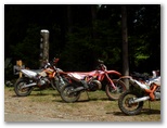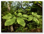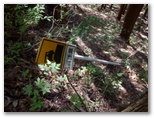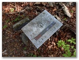 檥峠の十字路には、バイクを停めて休んでいるツーリングのグループがいました。私が休憩するような場所ではないと思ったので、撮影だけして通過。林道がUターンする直前で、フウリンツツジ(シロヤシオ)を見に、脇道へ入ります。その入口にあった「フウリンツツジ」の道標は撤去され、ロープが張られていました。ロープの先は二俣です。ここには、道標を掘り出した跡がまだ残っていました。右の道の終点まで行って見たのですが、それらしい木が見つかりません。