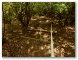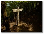林道(ここでは奥武蔵グリーンライン)は当然ながら、途中の各峰を巻くように造られています。そのために、関東ふれあいの道が山道になるのは、峰を越える区間だけです。普段の山歩きでは、名もない峰はできるだけ巻き道を歩くものですが、ここでは巻き道(=林道)があるのに、わざわざ時間と労力をかけて峰越えをします。考えようによっては、アホらしい歩き方ですが、そうしないと、舗装道路ばかりを歩くことになってしまいます。