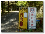 ツツジ山山頂から8分ほど下ると、「林道に出ます。注意しましょう」という看板がありました。「関東ふれあいの道」は、林道への出入りを頻繁に繰り返す道です。舗装された林道を歩いて行くと、バイカー(自転車乗り)やランナーが、次々とやって来ました。ランナーたちは5月19日開催のレースに備え、下見に来ているのかと思ったら、コースの山道は走らないで、林道だけを走っています。奥武蔵グリーンラインは、サイクリングとランニングの人気コースのようです。