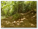 うーむ。木はどこかにあるはず。ゴヨウツツジなら、花がなくても、葉が開いてなくても、見分けられます。二俣に戻り、林の中を探し、また二俣に戻って、左の道も探してみました。白い花はどこだ? 5枚葉はどこだ? かれこれ30分以上費やしても見つけられませんでした。残念ながら、今回はあきらめることにします。林道に戻ると、暑さのせいもあり、がっくり疲れました。次の飯盛峠に向かいます。関八州見晴台のツツジを楽しみに、トボトボ歩いて頑張りました。