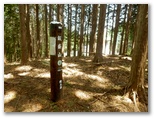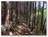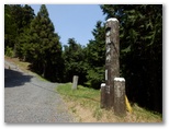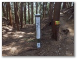 美しいツツジを見ながら、長めに休憩したので、かなり元気を回復しました。引き続き、関東ふれあいの道を東に進みます。高山不動尊奥の院を後にして、やや急な山道を下って行くと、狭い峠にピョンと下り立ちました。峠の名は書いてありませんが、標柱が1本あり、四寸道が分岐していることから、七曲り峠だということが分かります。この峠が第七番。ここから登り返してまた林道に下りた地点が、花立松ノ峠。黒山三滝に通じる林道猿岩線を左に分けます。第八番。