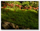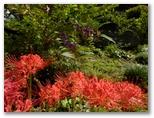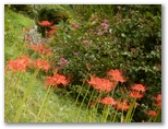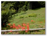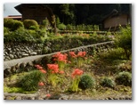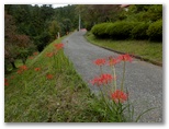 風影には、ひょっこり飛び出すように到着。元養蚕農家らしい大きな家があり、その庭から始まる小道に、ヒガンバナがほどよく咲いていました。南斜面は緑地で、果樹などが植えられています。家から草刈機を持った男性が出て来ました。私はここでは珍しい人。どこから来たかとか、朝早かったんでしょうとか、巾着田は混んでいたかとか、大体お決まりの雑談をします。きょうは共同の草刈り日らしく、男性の皆さん草刈機を肩に掛け、バリバリ刈って行かれました。