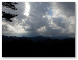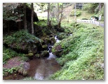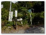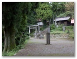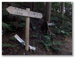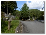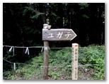エビガ坂まで10分ほどの所で、山道に光が差し込みました。見上げると、空の一部が晴れ、太陽が輝いています。よし、陽の射すうちにユガテに行こう、とギヤを上げました。ところがエビガ坂と書かれた場所を過ぎ、まもなくユガテに到着と言うところで、再び曇ってしまいました。でもまた晴れるかも知れません。ユガテに着くと、道標の指す先に、学校の正門にあるような石の門構えがありました。ここからコンクリート道を下って行ったのですが ...