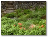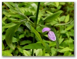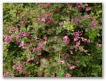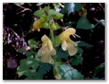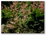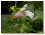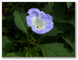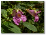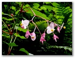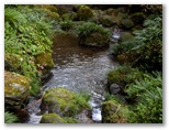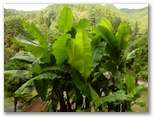 八徳の集落に近づくと、川が和風庭園の趣になりました。まるで庭師が造ったみたいですが、自然の造形なのでしょう。好奇心で川に架かる橋を渡ってみると、きれいな緑の苔に覆われた坂道が、緩く曲がりながら、上の方へと続いていました。元の道を三叉路まで戻り、道標が顔振峠を指す方向に進みます。この道の左右には、バショウの大きな葉がワサワサとして、バナナにそっくりです。昨年も撮ったシュウカイドウの咲く坂道を上りきると、展望の道になりました。
