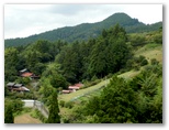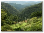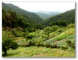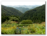 顔振峠への山道を右に分け、車道を少し登り、展望の優れた場所に行きました。と言っても、どなたかの家の前です。人の姿が見えなかったので、わざわざ挨拶には行きませんでしたが、遠慮しつつ、展望を楽しませていただきました。目の前の斜面は、野菜や花を作る畑。その向うに、山々が幾重にもV字状に重なって、果てしない奥行きを思わせる風景。こんなところに生まれ育った人は「ここには何もない」と言ったりもしますが、もちろん、かけがえのない故郷です。