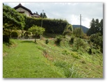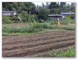 間違いなくユガテに到着したものの、その道は行き止まり、どなたかの家に入る道でした。急いで引き返します。先ほどの道標をよく見ると、腕木の指す方向ではなく、道標の直下に抜け道のようなものがありました。ここを下ってみましょう。すると細い道が民家の裏庭を回り込み、畑の向うへと通じていました。畑道には赤と白のヒガンバナ。簡素な手作りのフェンスで仕切った畑地には、若い秋冬野菜が伸び始め、トウモロコシの株や素朴な案山子が突っ立っています。