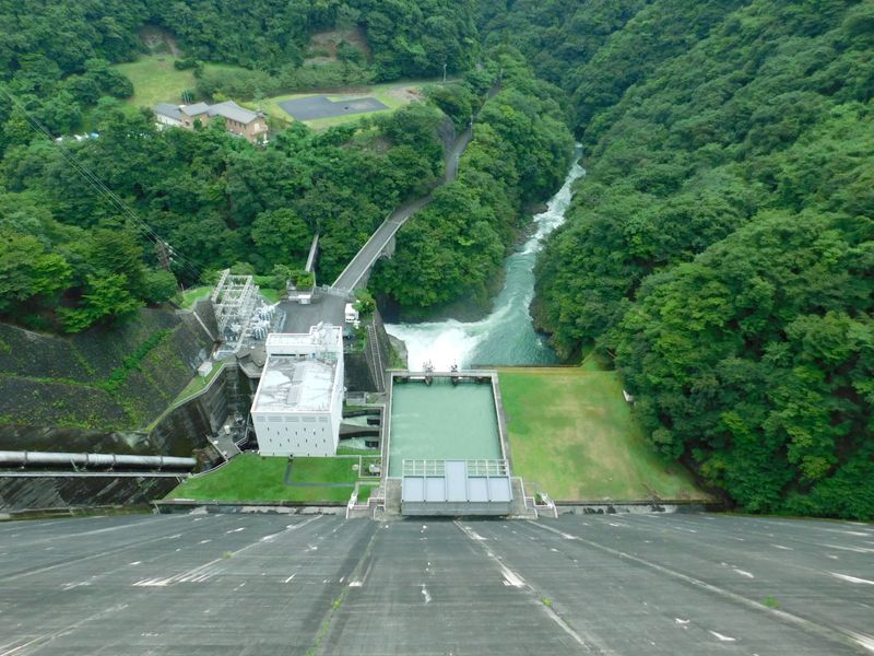 -- 小河内ダムの堤頂より発電所を俯瞰。