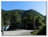 赤塗りの大岳橋のたもとから、大岳沢沿いの林道に入ります。季節感のあるイワタバコやヒメレンゲが目を楽しませてくれますが、他の花はあまり見られません。葉を食んでいた色鮮やかなフクラスズメ(蛾)の終齢幼虫が目を引きました。写真を掲載するのは、差し控えます。トンネルと書かれた珍しい洞門を抜け、大岳鍾乳洞前を通過し、「小滝」という名の滝を見上げ、大岳橋から約40分で林道の終点に至りました。