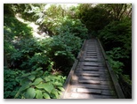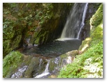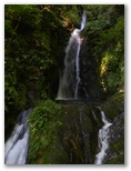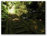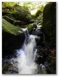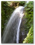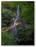 登山道に入ると、さっそく木橋とその注意書きがありました。「老朽化、通行注意、橋の真中をあるいて下さい」とのことです。「このハシ渡るべからず」とつぶやきながら渡りました。美しい緑の苔の生した岩がたくさんあり、白く泡立つ清流との取り合わせがとてもきれいです。その木橋から正味(道草を含まず)5分ほどで、大滝に到着しました。釜がすてきなプールになっています。ここで一浴びして行きたいと、強く思いましたが、写真だけ撮って巻き道を登りました。