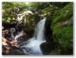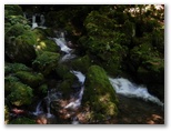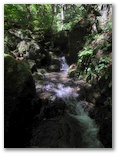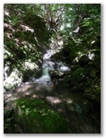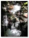 小滝が絶え間なく現れますが、水流の中心線を快調に進めました。倒木などの障害物がある場合でも、簡単に迂回できます。子供連れで来た場合、大きめの滝は迂回し、小さめの滝だけ登っても、十分にシャワークライミングが楽しめそうです。登山道が木橋で右岸から左岸に移る、その少し手前に、3m近くのすてきな小滝が見えてきました。水流がかなり強そうなので、デジカメをプラ袋に入れます。正面からまともにシャワーを受けながら登りました。