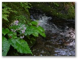 滝のすぐ上の木橋から、簡単に沢に下りられました。今回もマリンシューズに履き替えて入渓します。そこは、緑の岩と白い流れの岩石園。目に、耳に、肌に、そして足に、すばらしい感覚が襲ってきます。じゃぶじゃぶ、ザブザブ、ビシャッビシャッ。大自然の中で童心に帰って、ひたすら楽しく歩きます。近くに登山道が並行しているのですが、誰もいません。沢のアクセントは、紫色のイワタバコ。星形の小さな花が、本当に岩から生え出ているように見えます。