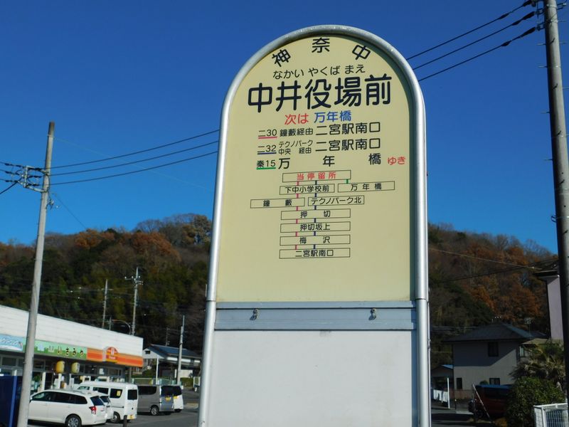 -- 中井役場前バス停。次のバスは8分後。12:10