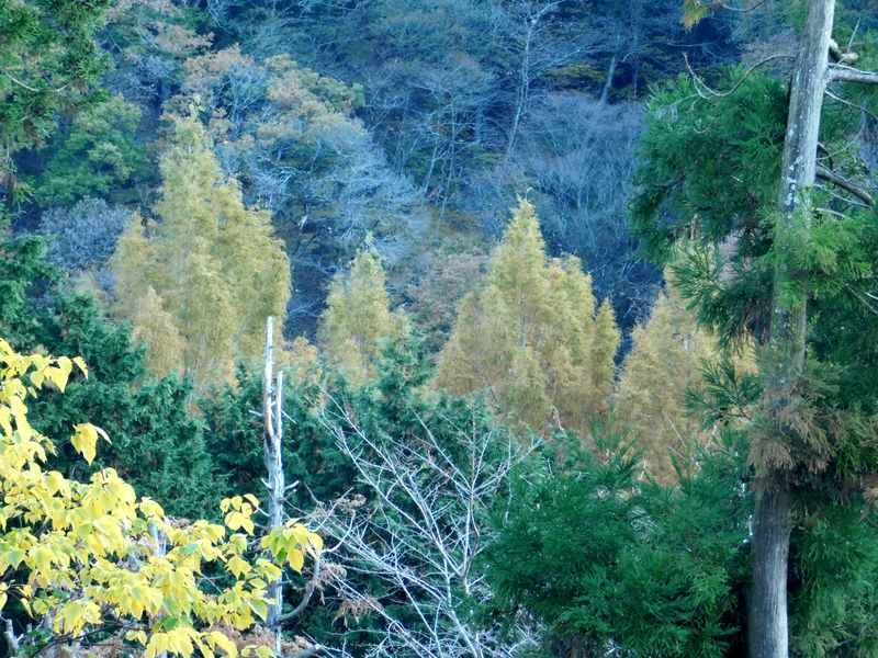 -- 元の道に戻る。メタセコイアらしい高木が見える。