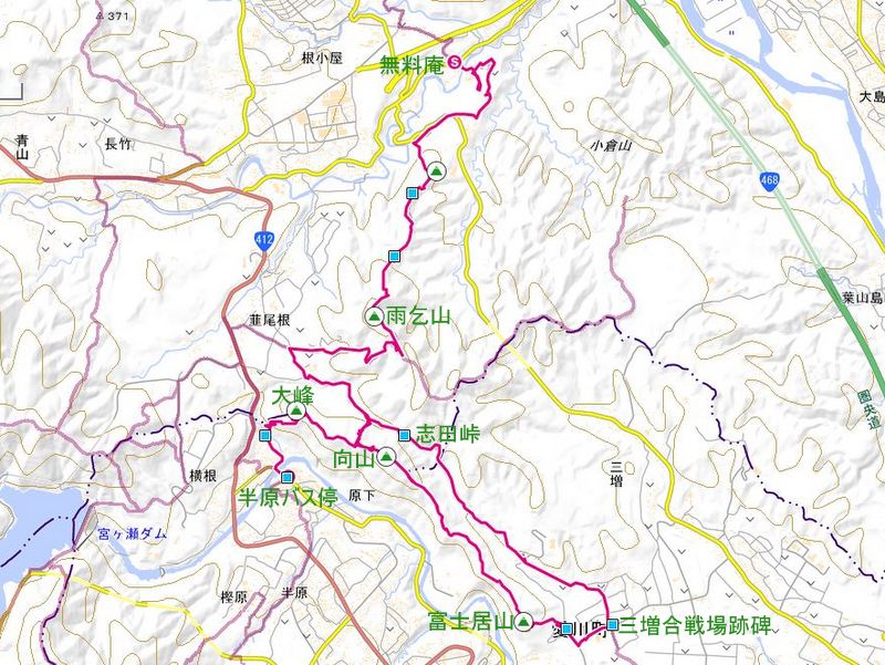 雨乞山と三増(みませ)合戦場跡は、関東ふれあいの道(首都圏自然歩道)にあります。