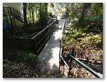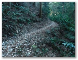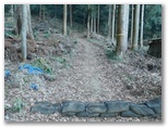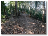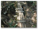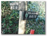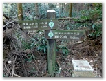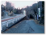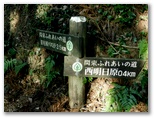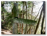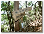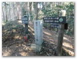 雨乞山頂には5分ほど滞在しただけで、先に進みました。足も軽やか、スタコラ下っていきます。やがて白い石柱の立つ分岐点が見えてきました。三増峠への分岐点です。関東ふれあいの道の道標が立っていますが、三増峠方面を指す腕木はありません。ここで鋭角に右折します。道の状態も良くなり、ルンルン気分で下っていくと、ちょっと怖そうな木橋がありました。これを静かに渡って、5分ほど行ったところで、山道があっけなく終わりました。