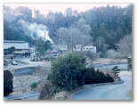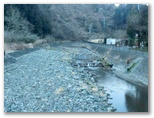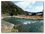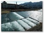 道標に従って、坂道を下っていくと、串川の対岸に、白煙を上げる「酒蔵」が見えました。串川に架かる平井橋を渡りながら川を眺めると、「くしかわ姫」が櫛を落としたという鳥屋あたりにおける川幅よりも、ずっと幅が大きくなっています。でも流れる水の量は、鳥屋あたりと大して違わないように見えます。気候によっては、川原で遊ぶこともできるかもしれません。でも周囲の森が冬枯れの今、早朝の冷えた川原に生きものは見られず、ただ寂しい風景です。