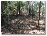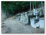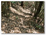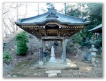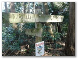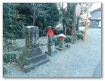 270段ほど上ると、鐘楼と本堂のある庭に出ました。静寂の空間です。庭の奥からさらに数十段上ると、尾根の上に至り、木漏れ日の中に石塔や石碑が立っていました。この辺りは、霊的異空間のような趣が漂います。地図を見ると、ここから大峰はごく近く、一瞬迷いが生じましたが、計画通りに関東ふれあいの道を歩いて、三増合戦場跡に行くことにしました。上ってきた石段を下ります。この時、ランからまた猛烈に吠えられました。