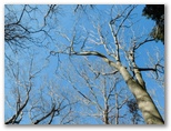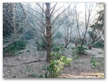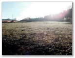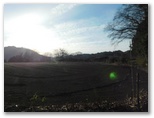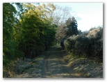 さらに1分ほど行くと、ベンチが1脚ありました。ここに座って何を眺めるのでしょうか? 試しに座ってみると、目の前一面に霜の降りた草地が白く光っていました。今朝も空気が冷え込んでいますが、歩いているためか、寒くはありません。でも汗をかきすぎないよう、ジャケットの胸のジッパーを上げ下げして、体温を調節しています。このベンチから3分ほど行くと、山裾に入り、関東ふれあいの道も「山道」に変わりました。