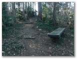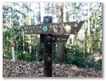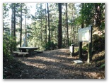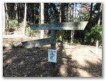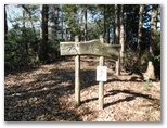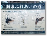 山道のはじめは、勾配も緩やかで、歩きやすい杉林の道でした。その後、落葉樹が増え、落ち葉がかなり積もっていました。でも足が滑るほどではありません。さすが首都圏自然歩道、家族向きのハイキングコースとしてよく整備された道です。山道に入ってから8分ほどのところに、テーブルとベンチの置かれた休憩所がありました。大きなイラスト入りの説明板に「林でくらす生物たち」と書かれています。地面には、おなじみ関東ふれあいの道の石板もあります。