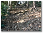 急登の区間には、お助けのトラロープがありました。安全を確かめた上で、遠慮なく使わせてもらいます。さもないと、落ち葉で足元がズルズルと滑るからです。取り付きの石段から約10分で、富士居山頂に着きました。三等三角点がありますが、樹木に囲まれて、展望は利きません。その後も眺望はほとんどなく、軽いアップダウンを繰り返しながら進んで行きました。確かにヤブ山ですが、1か所、宮ヶ瀬ダムを望める地点がありました。