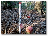 最後の行程に入ります。関東ふれあいの道を離れ、上志田バス停と首塚とを通過すると、愛川町農村環境改善センターが見えてきました。そのすぐ先、左手の石段が富士居山の取り付きです。最上段に「富士居山」と書いた標識があったので直ぐにわかりました。背戸の小山に登るような、軽い気分で登って行きます。近所の住人でしょうか、犬を連れた方々がいました。左手に、よく整った茶畑を望む地点を過ぎると、落ち葉の堆積した山道になりました。