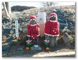その道標を見ると、直進は「韮尾根バス停0.6km」、左は「朝日寺1.0km」、同じく左が「北条武田合戦のみち15km」、来た道は「山里から津久井湖への道9.4km」とあります。私はもちろん左折しましたが、この時点で朝日寺に立ち寄ることは考えていませんでした。明るく、開放感のある農道を2分ほど歩くと、赤い毛糸のベビー服(のようなもの)を着た、可愛げなお地蔵様が2体立っていました。「こうの木地蔵」と書いてあります。