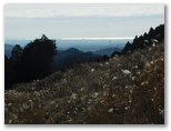 富士居山から正味50分ほどで、向山に到着しました。山頂に、NHKの施設があります。展望はありません。そして向山を越えると、ほぼ平坦な道となり、大峰に到着しました。きょうの最終目的地です。やはり展望はなく、感慨もありません。立ったまま、まだ温かかったココアを飲みました。そして頑丈そうな枝を拾い、これをストック代わりにして、下山の途に就きました。やや急勾配な道に、かなり落ち葉が積もっているので、滑らないよう、慎重に下っていきます。