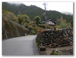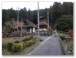 上坂集落へは、奥多摩霊園に通じるかなり傾斜のある舗装路を、標高差にして約90mほど登ります。やがて右手の谷の向こうに、天地山の前衛の674m峰が見えてきました。今が紅葉の盛りで、日が射せばどんなに美しくなることかと思います。天地山は霧に煙った頭だけが見えますが、鋸尾根の方は全く雲の中。天気予報は外れたのでしょうか? 舗装路が左へカーブするところに、大楢峠・御岳山を指す道標が立っていました。