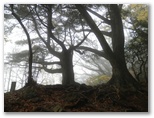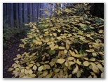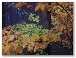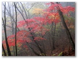 霧はあい変らず濃く、少し離れたところの木々は、みな淡い色彩です。魔法がかけられているみたいでもあり、これはこれで好いものですが、陽が当たればどんなに輝くだろうと思わずにいられない、見事な紅葉もありました。面白いのはモミの幼木で、濃緑の葉に赤いモミジ葉がいくつも差し込まれ、いたずらっぽく紅葉を装っていました。葉は表と裏とで色が多少異なります。一面に落ち葉が敷き詰められた場所は、どこを切り取っても彩色豊かな絵になっていました。