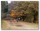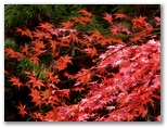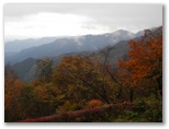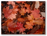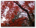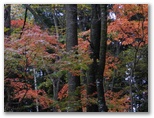 カエデ類の木々はたくさんありました。山の中腹では、地面にびっしりと紅葉が敷き詰められたところが何箇所もあったことから見て、紅葉の最盛期は過ぎたと思います。普通、落ちた葉は乾くとカールしたり、縮んだり、色も褐色に変化して行くものです。ところが、雨が降ったばかりなのか、落ち葉が濡れていて、美しい形と色と光沢とを保っていました。そんな場所で見上げれば、まだまだ紅葉が見頃の木もあれば、すでに終盤になった木もありました。