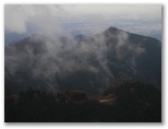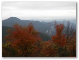 奥の院の参道を5分ほど下ると、東面の展望が開けた箇所がありました。足下は崖になっています。見渡すと、平野部は晴れている模様。御岳山、日の出山、金毘羅尾根は曇天下ながら、紅葉の色彩が見えます。晴れていれば、はるかに都心とその彼方も望めるでしょう。ここが、きょう初めてのビューポイントです。やはり、広大な展望は山登りの大きな醍醐味。風景であれ、自身の内面であれ、山で見たものは、人生の土産になります。