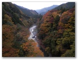 前日調べた天気予報では、上記の3サイトとも、晴れになっていました。夜が明けると、空がどんより曇っていましたが、電車に乗っているうちに晴れるだろうと、楽観しながら家を出ました。古里駅のプラットフォームに下り立つと、すでに8時だというのに、いやに暗い空。数馬峡橋から望む多摩川は、眠たそうな色の紅葉で彩られていました。でも、本格的な撮影機材を携えて橋の上から撮影している人も来ています。皆さん、天気予報を信じてきたのかな?