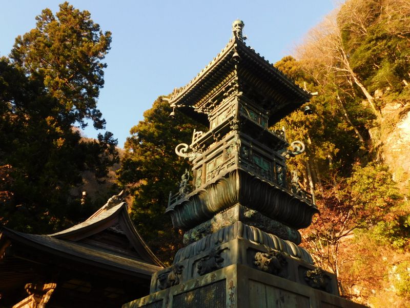 -- 大山寺の宝篋印塔。左は鐘楼の屋根。