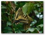 アキアカネがたくさん飛んでいます。そののどかさを破るように、乱舞するキアゲハの群れ。オスたちがメスを追い回しているのでしょう。大型で色鮮やかな蝶たちが、縦横無尽に飛び回る山頂。なかなかの見ものです。ふと目の前の木の、黄色い何かに目が引かれ、よく見ると、それは交尾中のキアゲハのペアでした。上の蝶がオスでしょうか?小枝にしっかりつかまって、お尻の先に配偶者をぶら下げています。下の蝶は完全に手ぶらです。