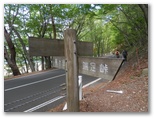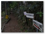 本栖湖キャンプ場に進むと、松林の奥に、富士山の大きな頭が見えました。風雪を感じさせるバンガローの立ち並ぶキャンプ場を通り抜け、国道139号を横断すると、もう大きな人工物はありません。自然林の中をいくつもの道標に導かれて、竜ヶ岳登山道入口に至りました。熊出没注意の黄色い警告板があります。