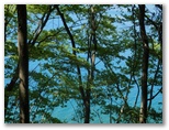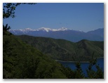 これより、新緑の明るい、ゆるやかな登山道を登ります。さまざまな樹種の混合した自然林から、ほとばしる生命力が感じられ、足も腰も、肺も心臓も、全身が快調そのもの。パーティー唯一の女性に合わせて、極めてスローペースで登りましたが、登山道入口から30分ほどで、休憩所のある小さなピークに達しました。青い本栖湖の向こうに、くっきりと立つ南アルプスの白峰三山と甲斐駒ケ岳。一同が歓声を上げます。