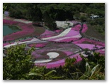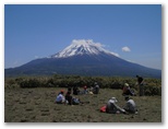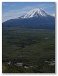 ここから先は、ずっと富士山が見えるようになりました。近いから当たり前なのですが、とても大きな富士山です。特に向かって右(南方)のラインの、スーッと駿河湾に延びて行く様が優美です。眼下には、赤紫・白・ピンクの、絵の具を塗ったような「富士芝桜まつり」の会場が、青と緑の広大な空間の中で、鮮やかなアクセントになっていました。