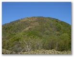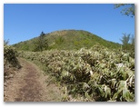 高い樹木がなくなると、スズタケの世界になりました。行く手の竜ヶ岳がふっくら、巨大な饅頭になっています。山体が球面なので、視線が山頂に届くには、理論上山頂付近まで行かねばなりません。明るい登山道には、ヒメハギ、ニガイチゴ、キスミレなどが咲いていました。振り返ると、富士山に加えて、御坂山塊が立体感も豊かに峰々を連ね、あとは一面の樹海。あそこに迷い込んだらどうなるのでしょうか?