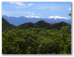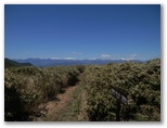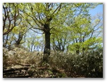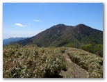 さて、名残り惜しい山頂ですが、下山の途に着きます。山頂から南西の端足峠(はしたとうげ)に向かう道は、緩やかな下りで始まって、すぐに急降下になりました。幸い、つかまる樹木もほどほどにあるので、安心感があります。新緑の広葉樹に混じって咲くトウゴクミツバツツジは、ほとんどスズタケばかりの東面登山道よりも、こちらで多く見られました。樹木が切れるたびに、ずらり南アルプスの峰々が望めることは、西面を歩く人々への特典かもしれません。