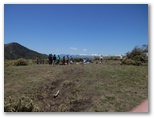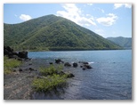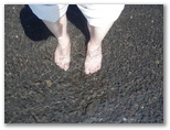 元気な男性二人が山を駆け下り、県道を駐車場まで走って、車で迎えに来てくれました。パーティーが健脚の男性ばかりだったら、こんなことはしません。感謝しながら車に乗り込むと、私の希望で一旦キャンプ場入口に戻り、湖畔で靴を脱いでじゃぶじゃぶをしました。溶岩の粒粒が足裏をほぐしてくれるような気もしましたが、本栖湖の水がとても冷たかったので、すぐに水から上がりました。