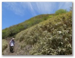 石仏から上は、ほとんど山頂までジグザグの連続です。折り返すたびに、富士山が右に見えたり、左に見えたりします。前後の人との距離が開くと、スズタケに隠されて人の姿が見えなくなるので、よくまとまって歩きましょう。時々登山道から蝶が飛び立ちます。ミヤマカラスアゲハが凄いスピードで頭上を通過して行きました。